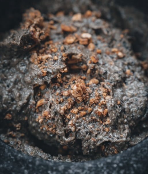 Har du plockat en massa strävsoppar som blir mörka vid tillagning och vet inte vad du ska göra av dem? En pastej är det perfekta valet. Mörka belugalinser, med mörkare soppar eller kanske svart trumpetsvamp blir till en härligt krämig exklusiv röra som kan serveras som tilltugg på ett vackert knäcke. För att boosta smaken och näringsinnehållet ytterligare tillsätter vi rostade valnötter och kryddar med korianderfrön. Detta är en helt vegetabilisk rätt med en underbar smak och väldigt mycket näring.